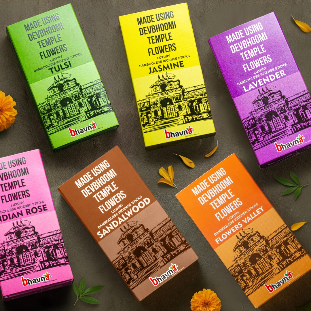Unveil the divine and positive aroma of Bhavna Luxury Incense – 6-in-1 Bambooless Combo Pack, thoughtfully crafted with pure and natural ingredients to bring a soothing and uplifting fragrance to your space. This special combo features six divine aromas: Valley Flowers, Jasmine, Sandalwood, Indian Rose, Lavender, and Tulsi, each offering a unique and refreshing scent experience. These bambooless, charcoal-free incense sticks ensure a clean, smoke-free burn, gently releasing long-lasting fragrances that linger beautifully. Ideal for pooja, meditation, relaxation, or daily rituals, they help create a peaceful and spiritual ambiance, enhancing your moments of prayer and mindfulness. Let these calming and sacred aromas fill your home with positivity, purity, and serenity.